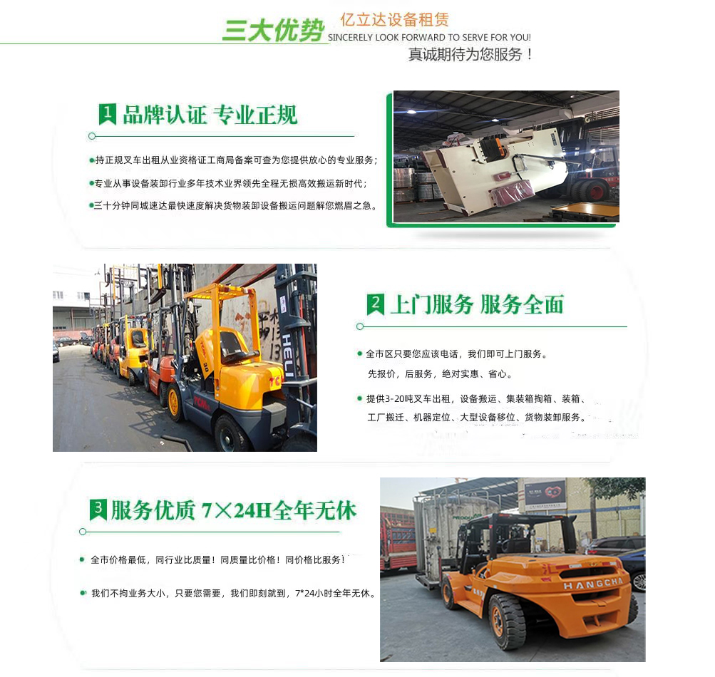 亿立达设备租赁有限公司是工商局准许的北京邮电大学世纪学院专业叉车出租公司,公司本着诚信、服务、效率、创新的经营理念,用精湛的技术,真诚的服务,为众多客户提供优质的服务,同时获得信赖与支持。专业提供北京邮电大学世纪学院3-20吨叉车出租、叉车租赁、设备搬运、集装箱掏箱装箱、机器移位定位、货物装卸、工厂搬迁、安全可靠,收费透明,价格便宜,随叫随到,24小时上门服务!本公司叉车吊车师傅对各种设备搬运装卸都有深刻探讨和研究。很多的疑难设备搬运,通过我公司的叉车师傅都能迎刃而解。对各种进口设备、国产机器、大型设备搬迁、高难度搬迁、各种精密仪器、医疗设备、科研设备等都能搬运; 提供全市 24 小时上门装卸搬运服务。同时提供厂房搬迁服务。 ...